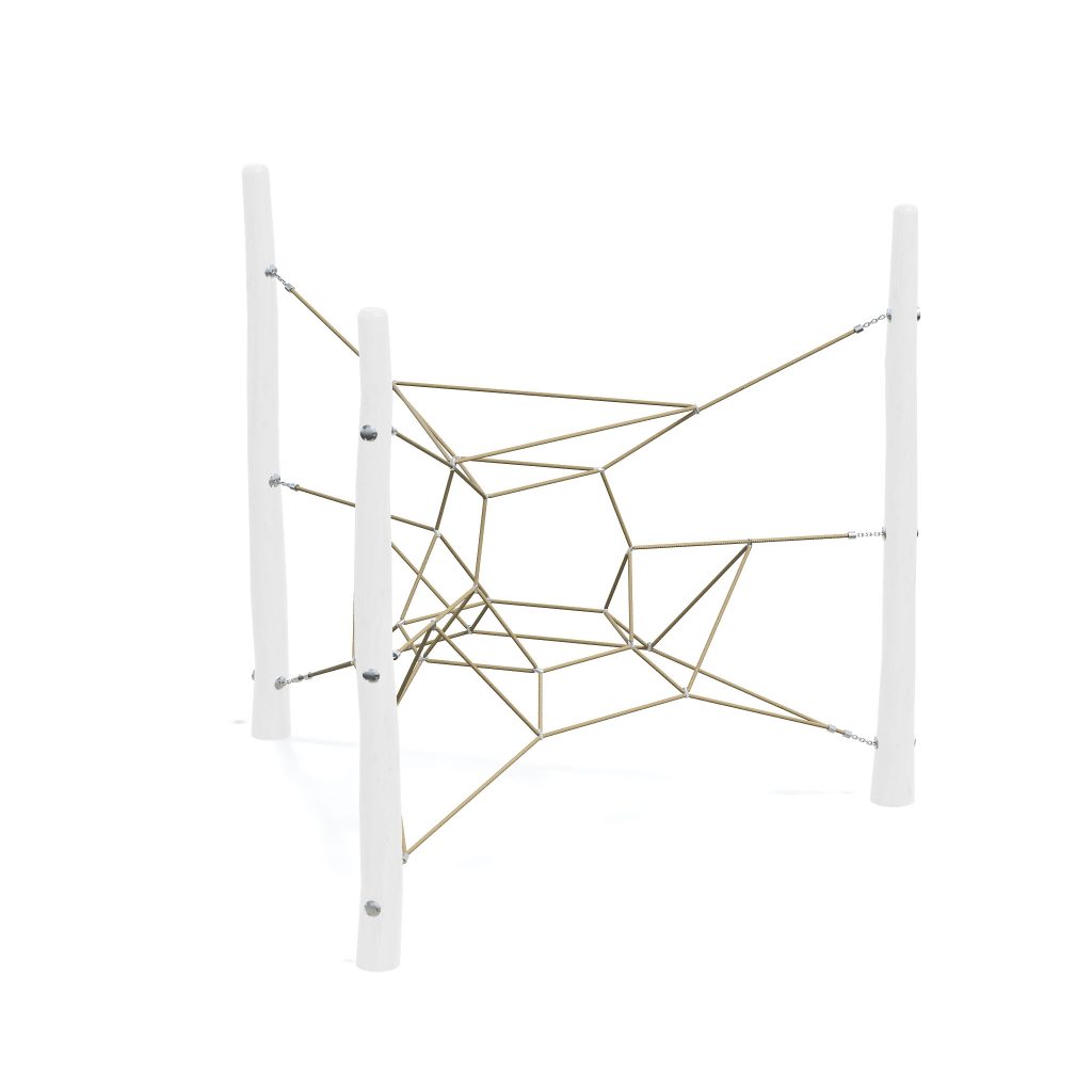 Natural Tricell features a triangular arrangement of timber climbing nets, combining natural materials with geometric climbing challenges.