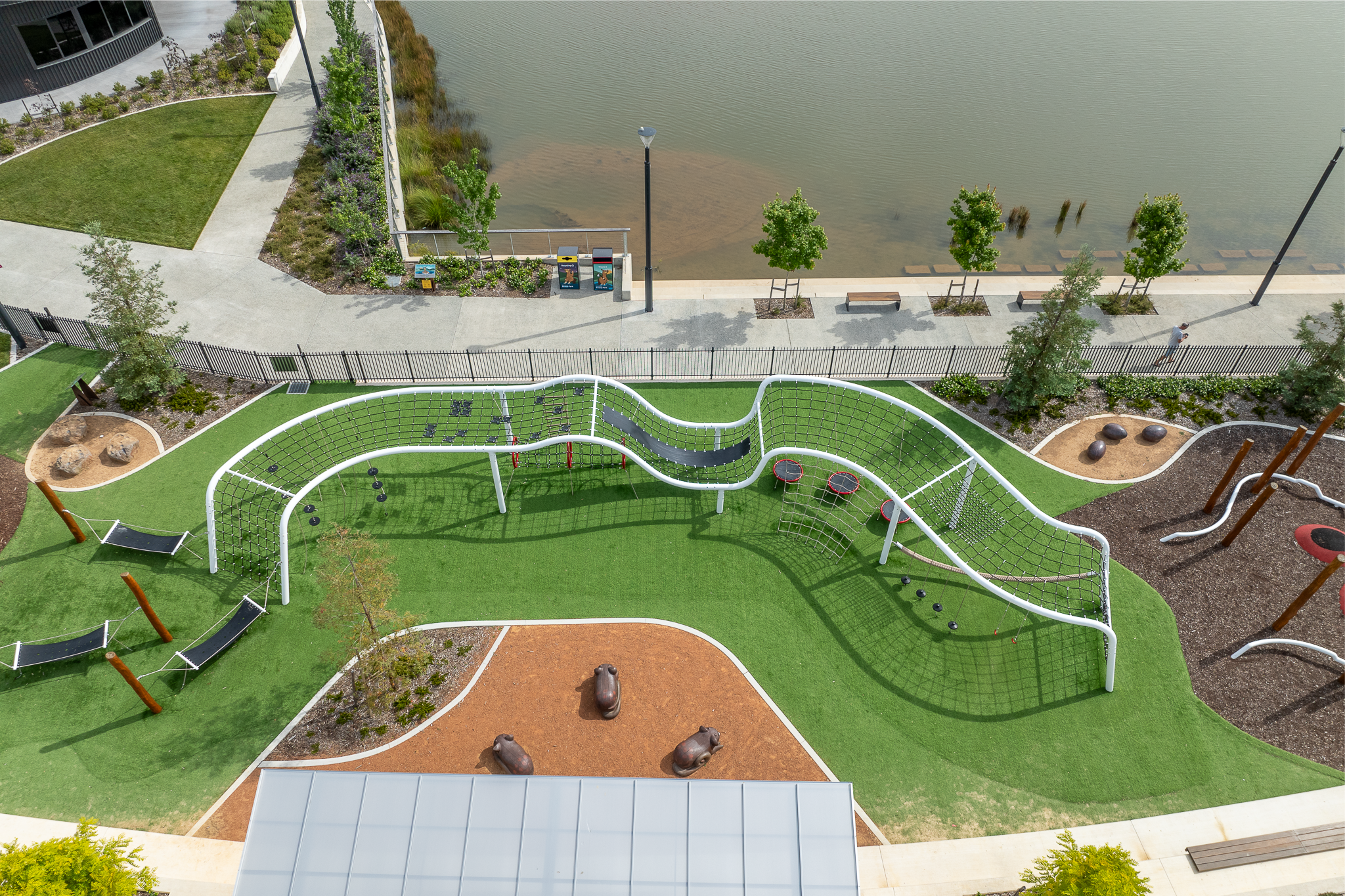 In the picturesque setting of Googong, ACT, where the serene waters of the Googong Billabong enhance the tranquil environment, a new playground installation has woven a thread of adventure into the fabric of the local community. The project, brought to life by Kaebel Leisure in partnership with the vision of AECOM & the flawless execution of Glascott Landscape & Civil, showcases a centrepiece that is as functional as it is artistic – a signature Spaghetti Structure, masterfully crafted to suit the dual demands of aesthetic elegance and interactive play.